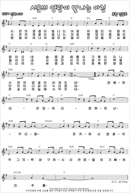 시온의 영광이 빛나는 아침_G코드 찬양 악보